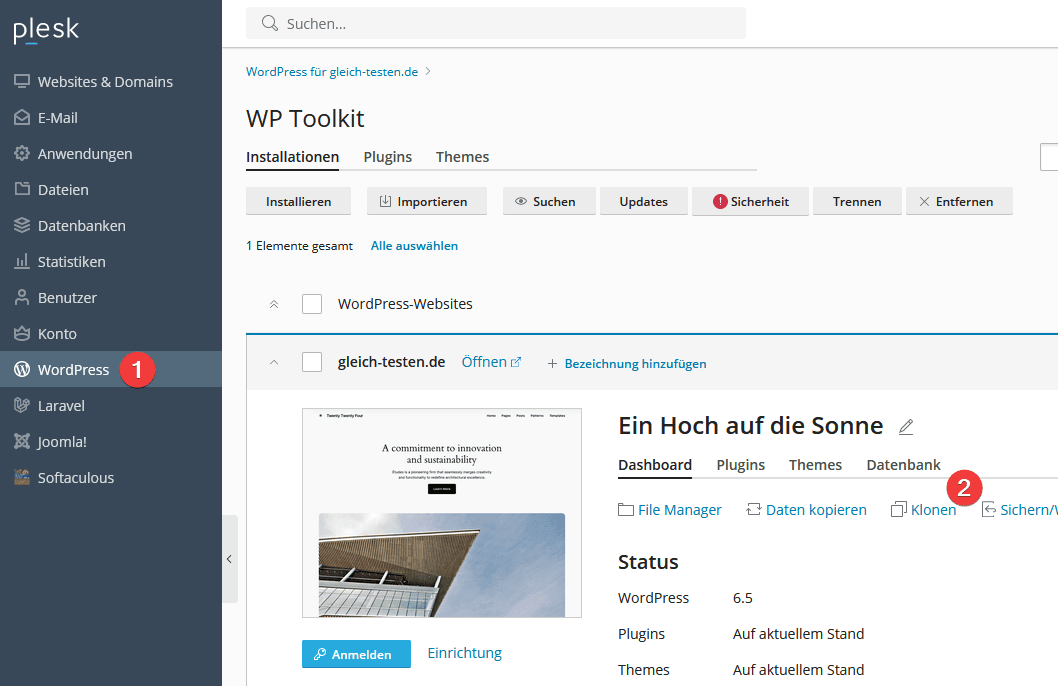 Um in Plesk mit dem WordPress Toolkit eine Staging Umgebung Ihrer Webseite zu erstellen, loggen Sie sich zunächst in das Plesk Interface ein und klicken Sie links auf „WordPress“ (1) und danach auf „Klonen“ (2):